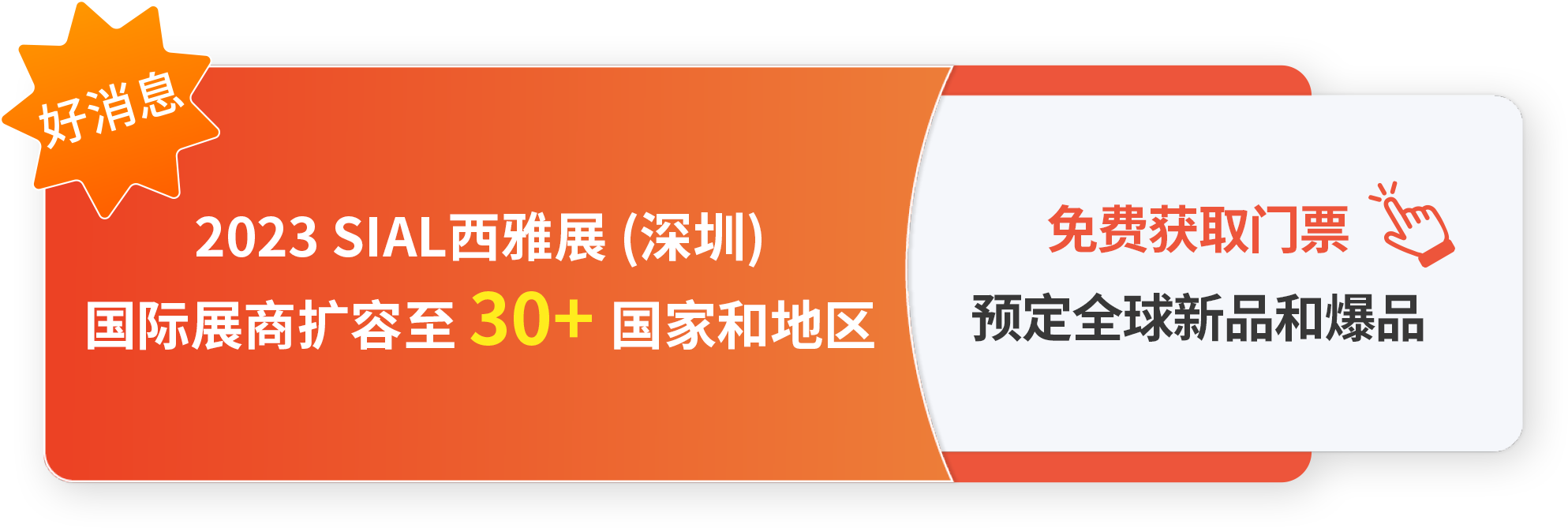 | 2023 SIAL西雅國(guó)際食品展(深圳)將于2023年8月28-30日在深圳福田會(huì)展中心拉開(kāi)序幕。作為覆蓋全品類的華南國(guó)際食飲交易展,現(xiàn)場(chǎng)將有1,200+國(guó)內(nèi)外食飲企業(yè)攜60,000+產(chǎn)品亮相,助您精準(zhǔn)貿(mào)易對(duì)接。 |