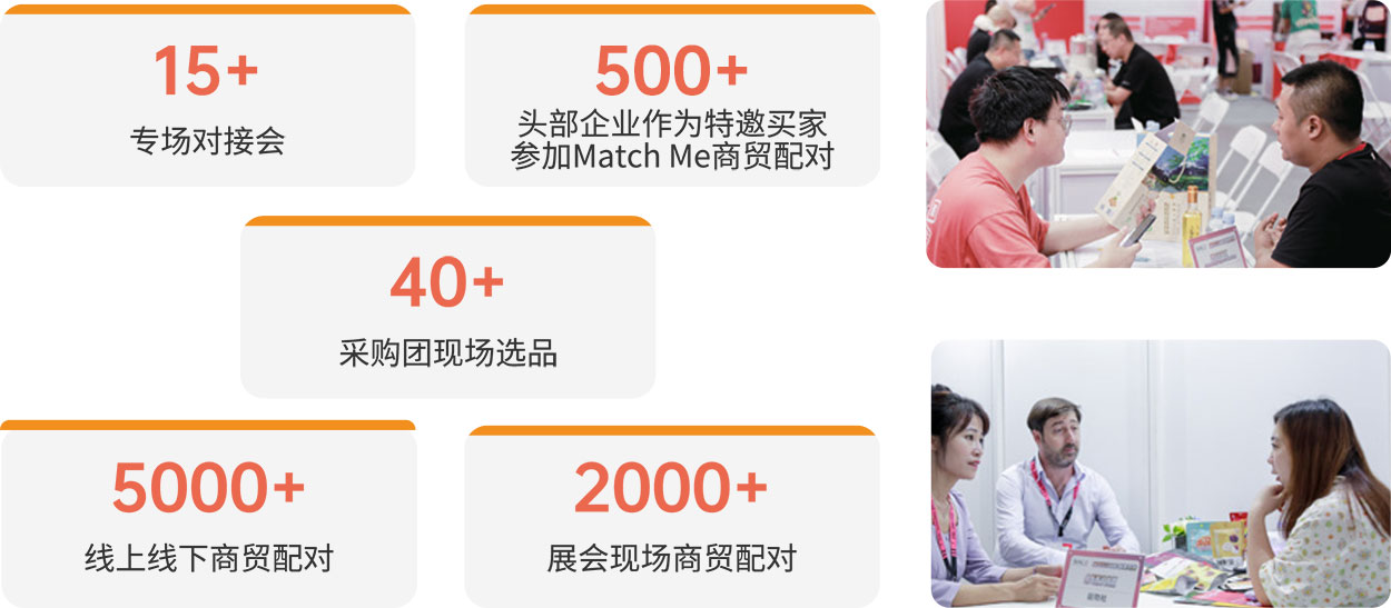 | 2023 SIAL 西雅展(深圳)為 600+ 展商和 500+ 特邀買家提供 Match Me 供需對接服務(wù),通過展位配對、團長選品區(qū)、大買家洽談間和對接會等多種形式為供需雙方成功搭建精準(zhǔn)、高效的貿(mào)易橋梁,現(xiàn)場共完成 5000+ 商貿(mào)配對場次。 |