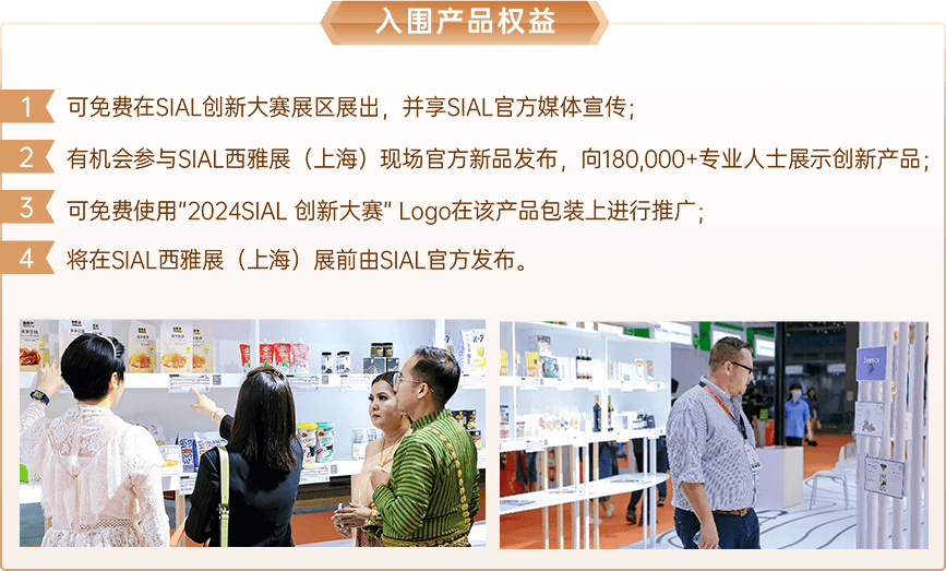 | “SIAL Innovation創(chuàng)新大賽” 參賽報名線上通道開放僅剩最后10天!2024 SIAL西雅展(上海)的所有展商均可參加!報名參與賽事,就有機會獲得向全球宣傳推廣創(chuàng)新產(chǎn)品的機會。報名截止日期:2024年4月22日 |