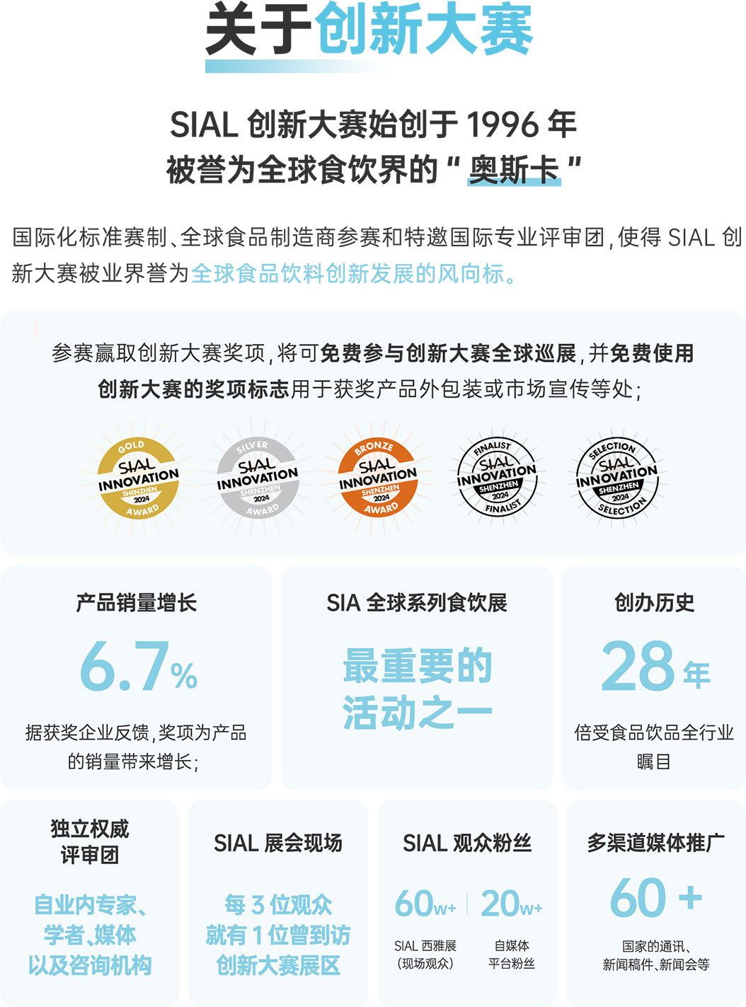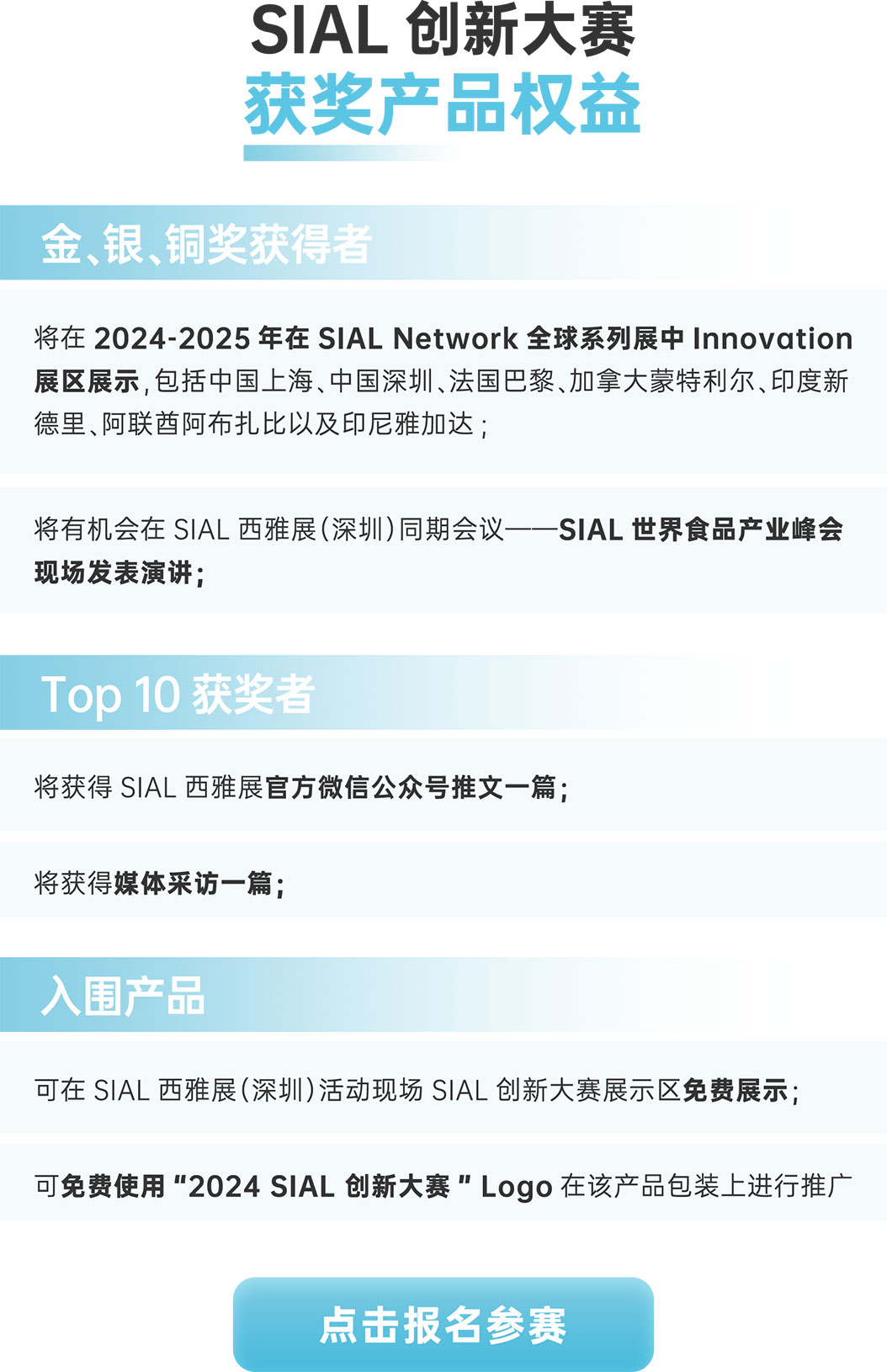 報名產(chǎn)品數(shù)500+,最終35件產(chǎn)品入圍,獲得金銀銅獎項的產(chǎn)品將在2024-2025年度SIAL全球巡展創(chuàng)新大賽展區(qū)進(jìn)行展出。