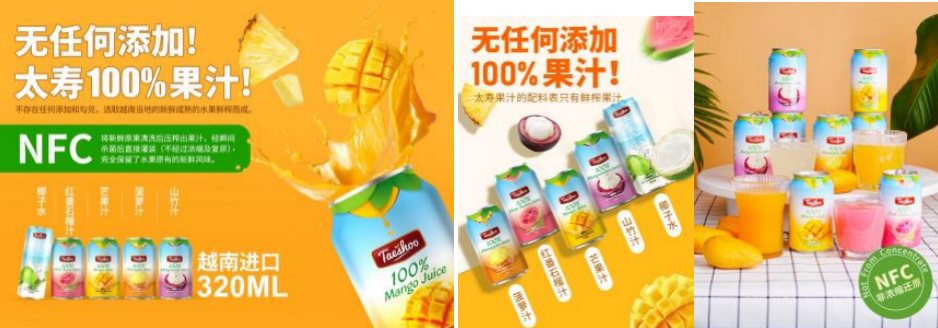 《植物水市場規(guī)模、份額、增長和行業(yè)分析》中指出,椰子水、楓樹水和樺樹水是全球最受歡迎的植物水品類。太壽100%椰子水中含有豐富的鈉、鎂、鉀等礦物質(zhì),能夠快速補充電解質(zhì),成分健康零添加、口感清爽味道好、低糖低卡不長胖。除了椰子水,太壽100%果汁也備受消費者喜愛,該產(chǎn)品全部選自越南當(dāng)?shù)厮a(chǎn)區(qū)的成熟新鮮水果。越南是熱帶季風(fēng)氣候,光照充足,雨量充沛,特別適合熱帶水果生長,產(chǎn)出的熱帶水果口味極佳。同樣,該產(chǎn)品采用的也是NFC非濃縮還原工藝,配料表只有果汁,不存在任何添加劑和勾兌,直接由鮮果壓榨(打漿)制得,沒有經(jīng)過濃縮后再兌水,不但能更好地保留水果原有的口味,更能鎖住更多營養(yǎng),更加健康。