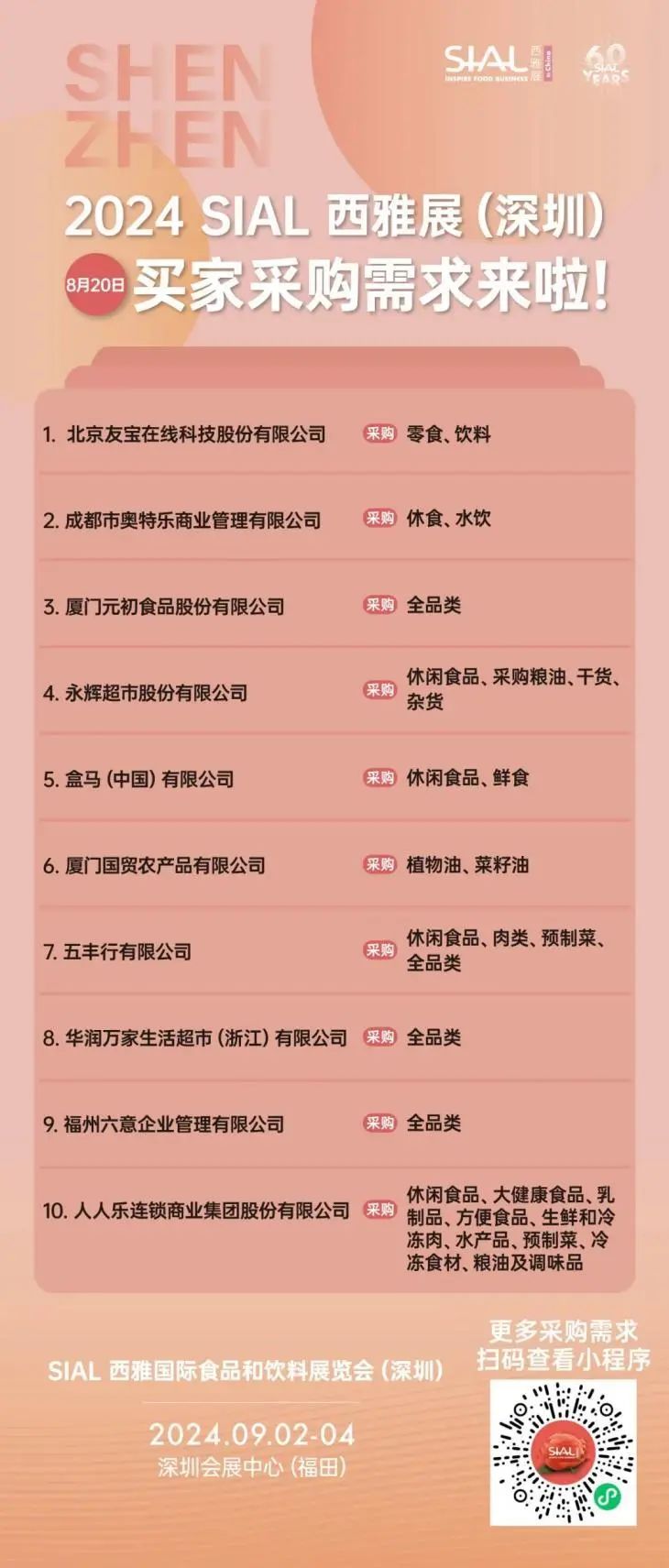 9月2日-4日在深圳會展中心(福田),SIAL 西雅展(深圳)將有更多來自海內(nèi)外的展商攜眾多新品參展:1,500+參展商,43+國際參展團攜數(shù)萬件產(chǎn)品參展,同時將吸引67,000多位專業(yè)觀眾/買家前來參觀。這無疑為食飲專業(yè)人士提供了解行業(yè)最新前沿趨勢、接觸新品和贏取更多商機的絕佳平臺。