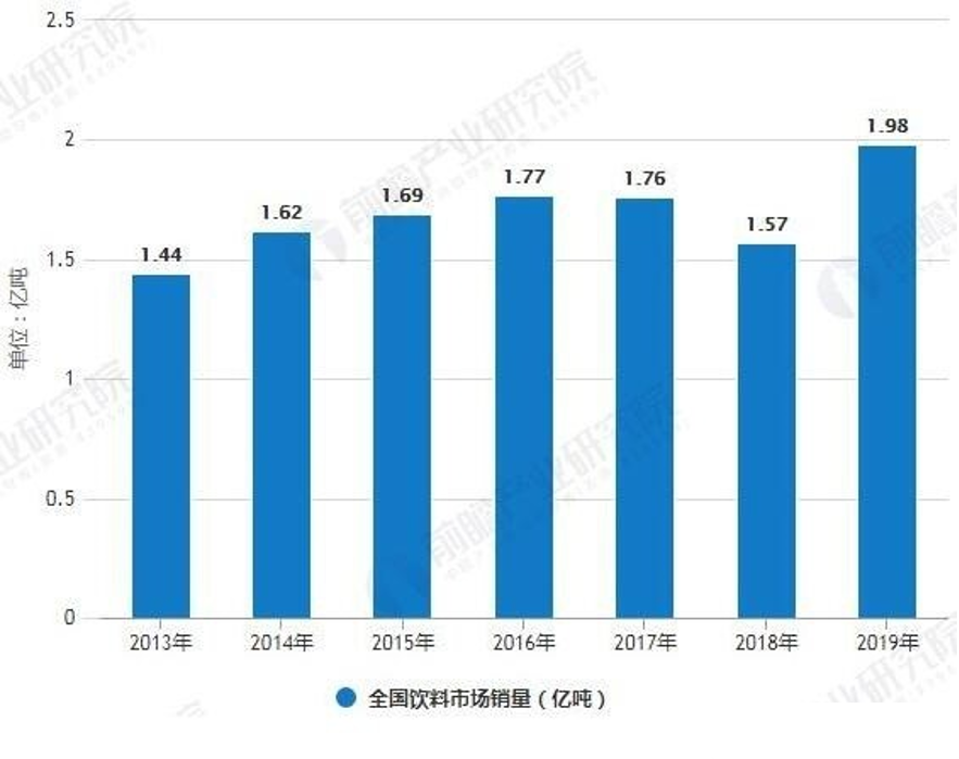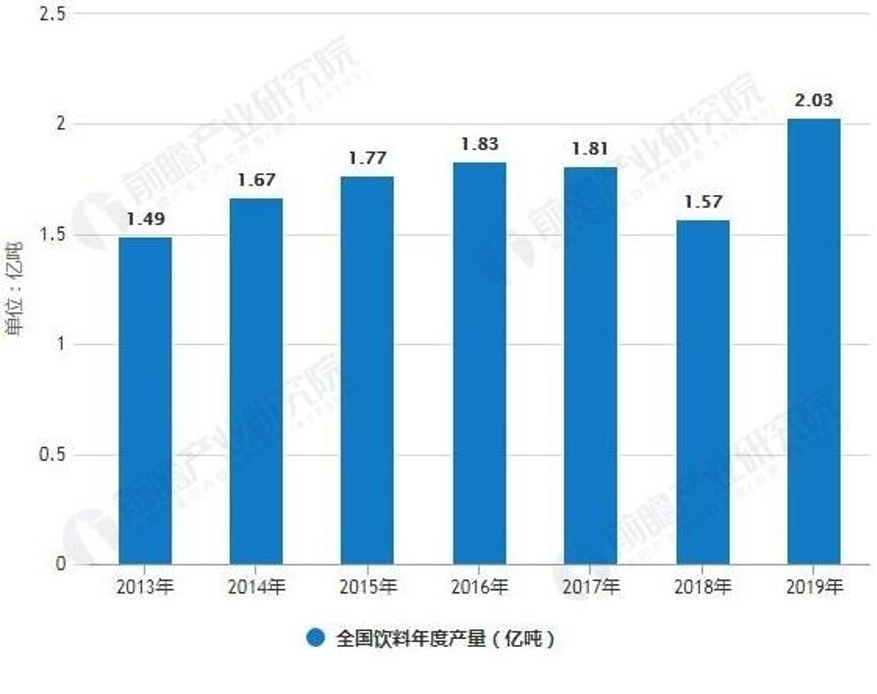當前,龐大的中國飲料市場依舊保持增長,據(jù)前瞻產(chǎn)業(yè)研究院發(fā)布的《中國軟飲料行業(yè)產(chǎn)銷需求與投資預測分析報告》統(tǒng)計數(shù)據(jù),截止至2018年底,全國飲料產(chǎn)量為15679.2萬噸,同比增長6.9%。預測2019年中國飲料市場將保持增長,產(chǎn)量將突破2億噸,達到2.03億噸。