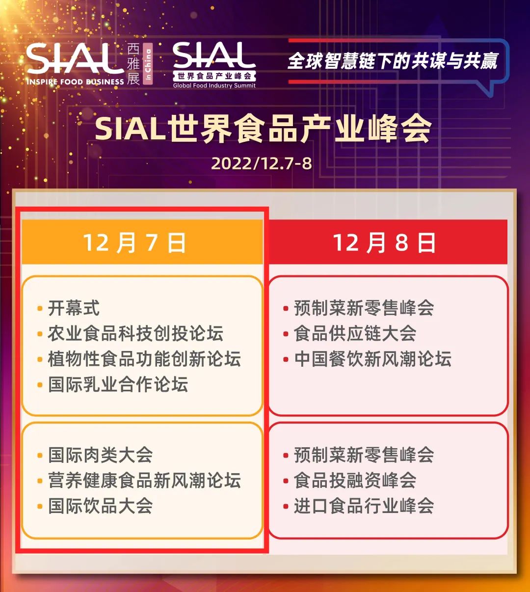 SIAL世界食品產(chǎn)業(yè)峰會(huì)將于2022年12月7日-8日正式舉辦!峰會(huì)將以“全球智慧鏈下的共謀與共贏”為主題舉辦包括預(yù)制菜、供應(yīng)鏈、農(nóng)業(yè)食品科技、乳業(yè)、肉類(lèi)、飲品、食品投融資、營(yíng)養(yǎng)健康食品、中餐、植物性食品、進(jìn)口食品在內(nèi)的11場(chǎng)主題論壇。