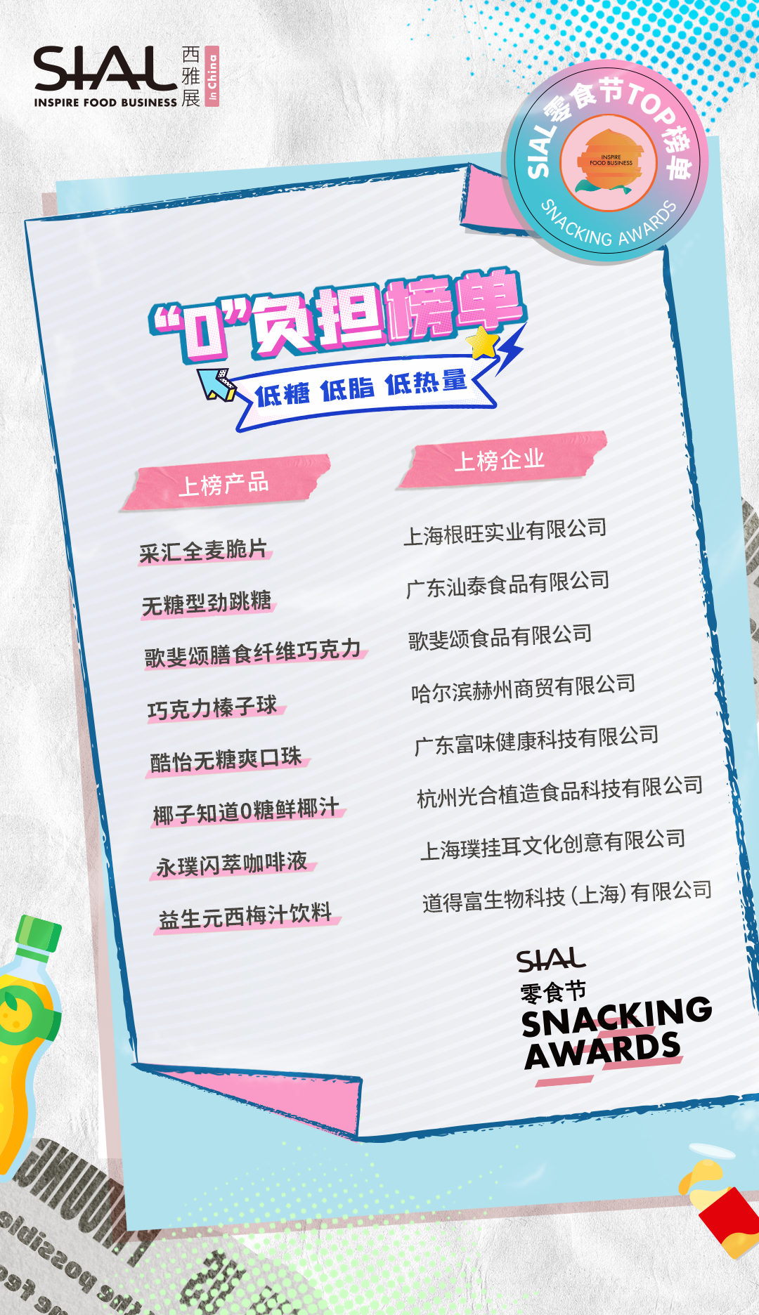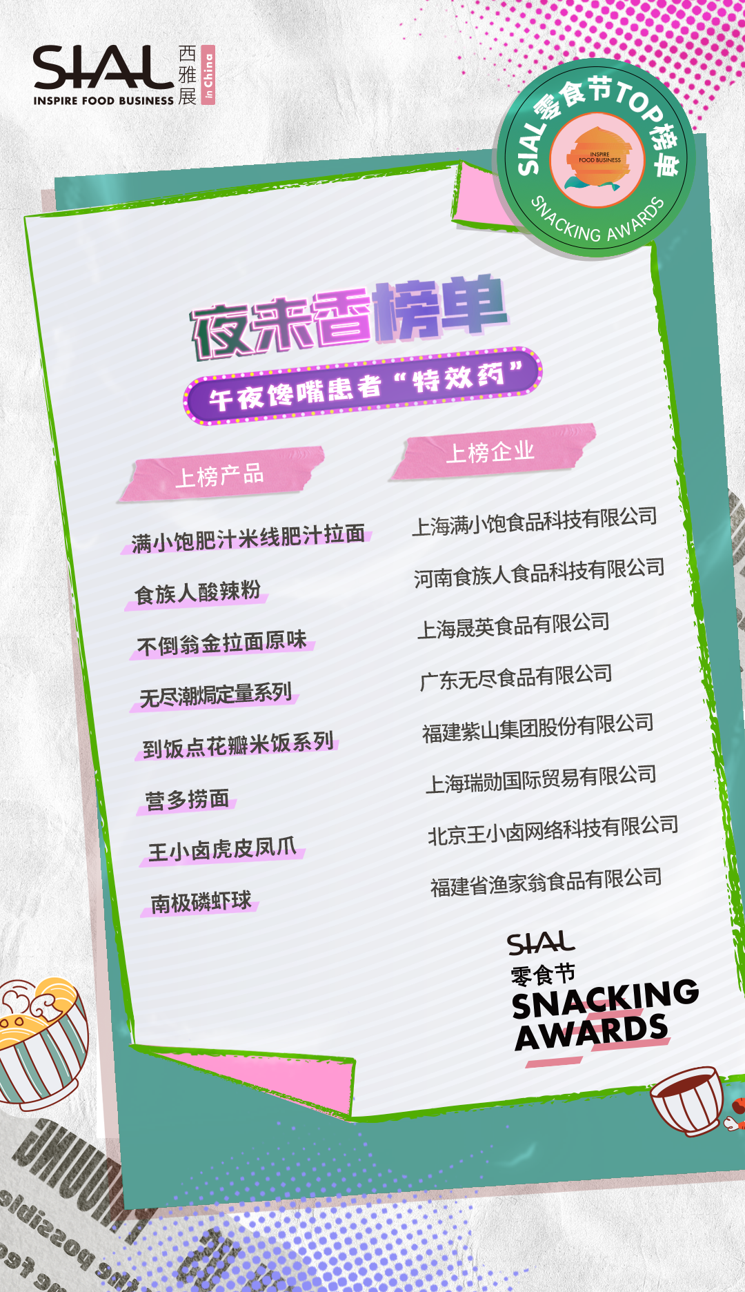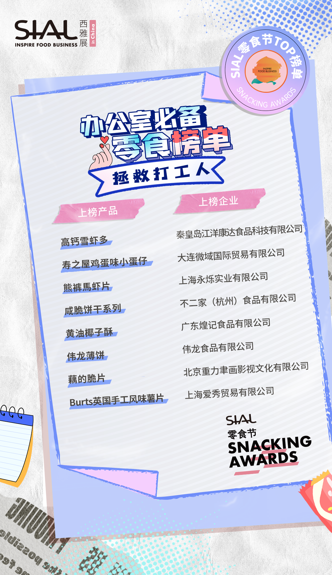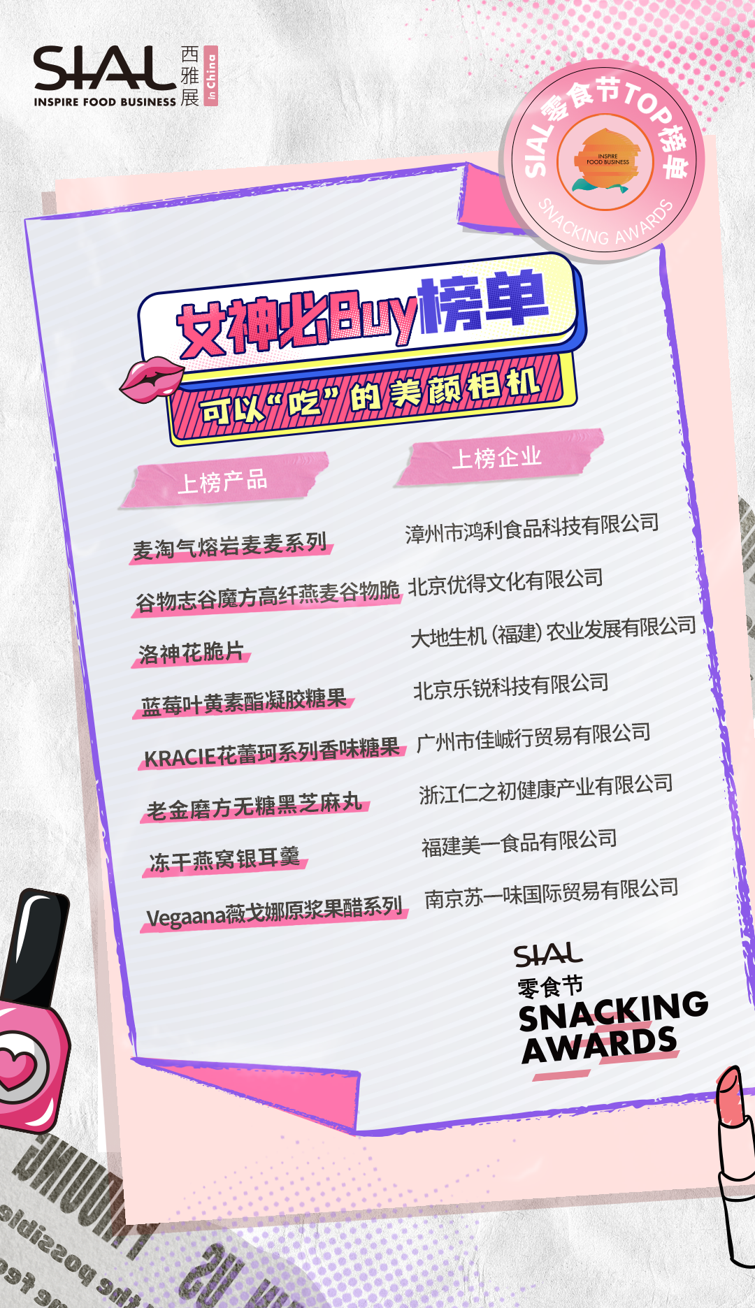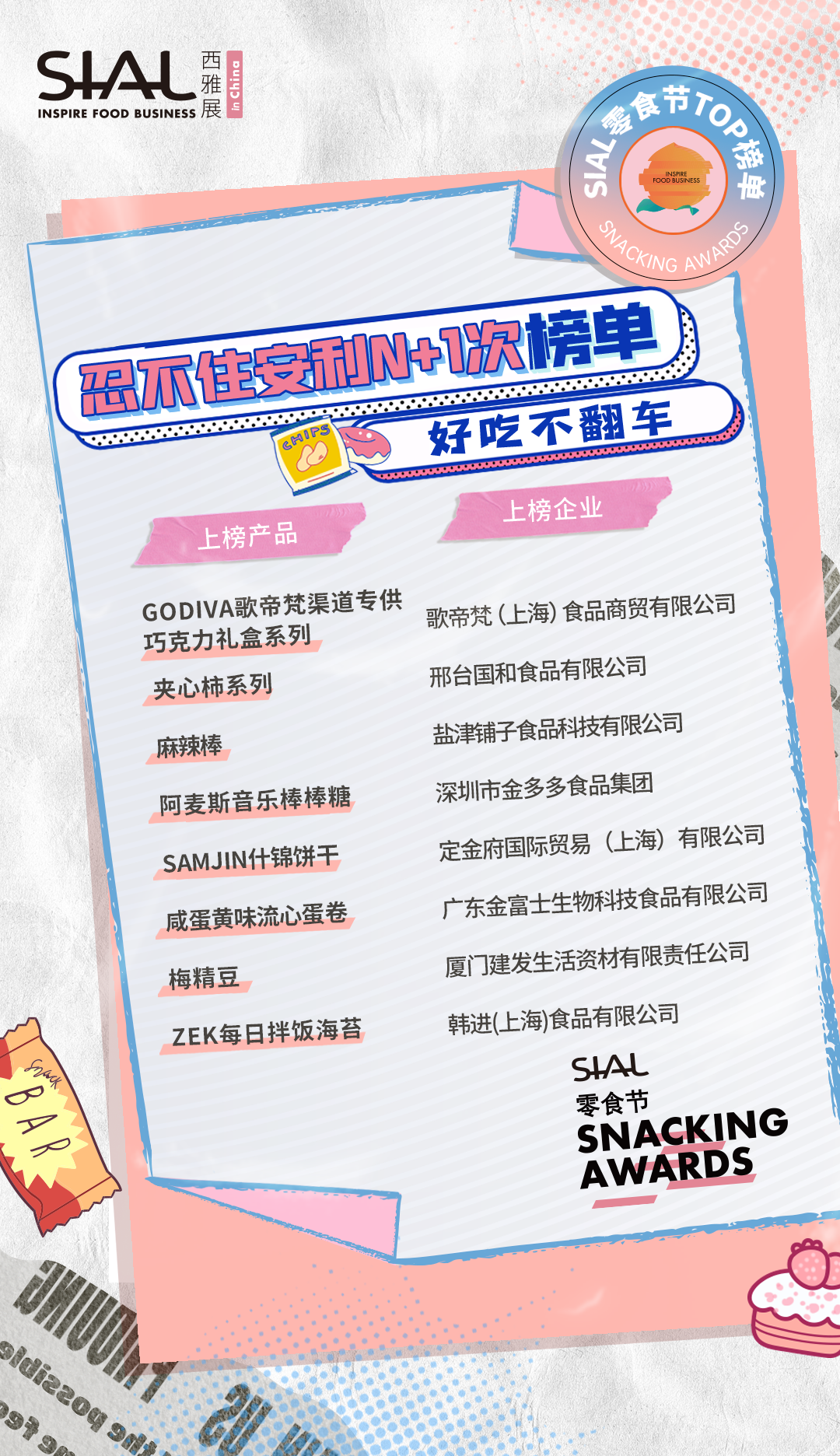 本次活動共計80家企業(yè)及產(chǎn)品榮膺SIAL零食節(jié)TOP榜單。上榜產(chǎn)品,均由C端消費者、B端專業(yè)用戶、頭部KOL、主辦方從“顏值包裝”“口味好評”“時下熱度”“健康低卡”“方便快捷”“創(chuàng)意獵奇”等多維度測評而出。