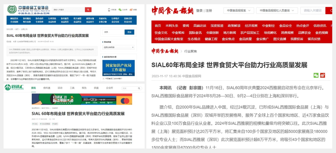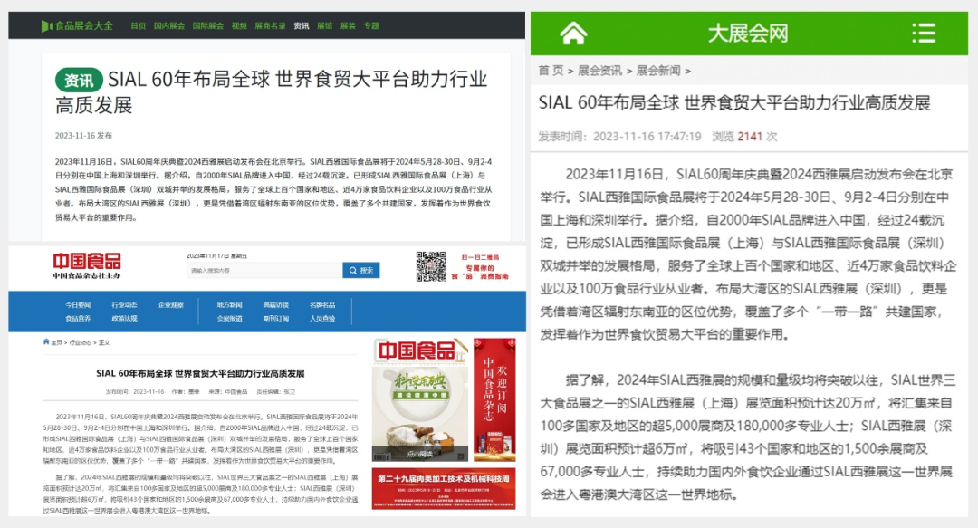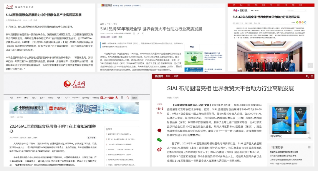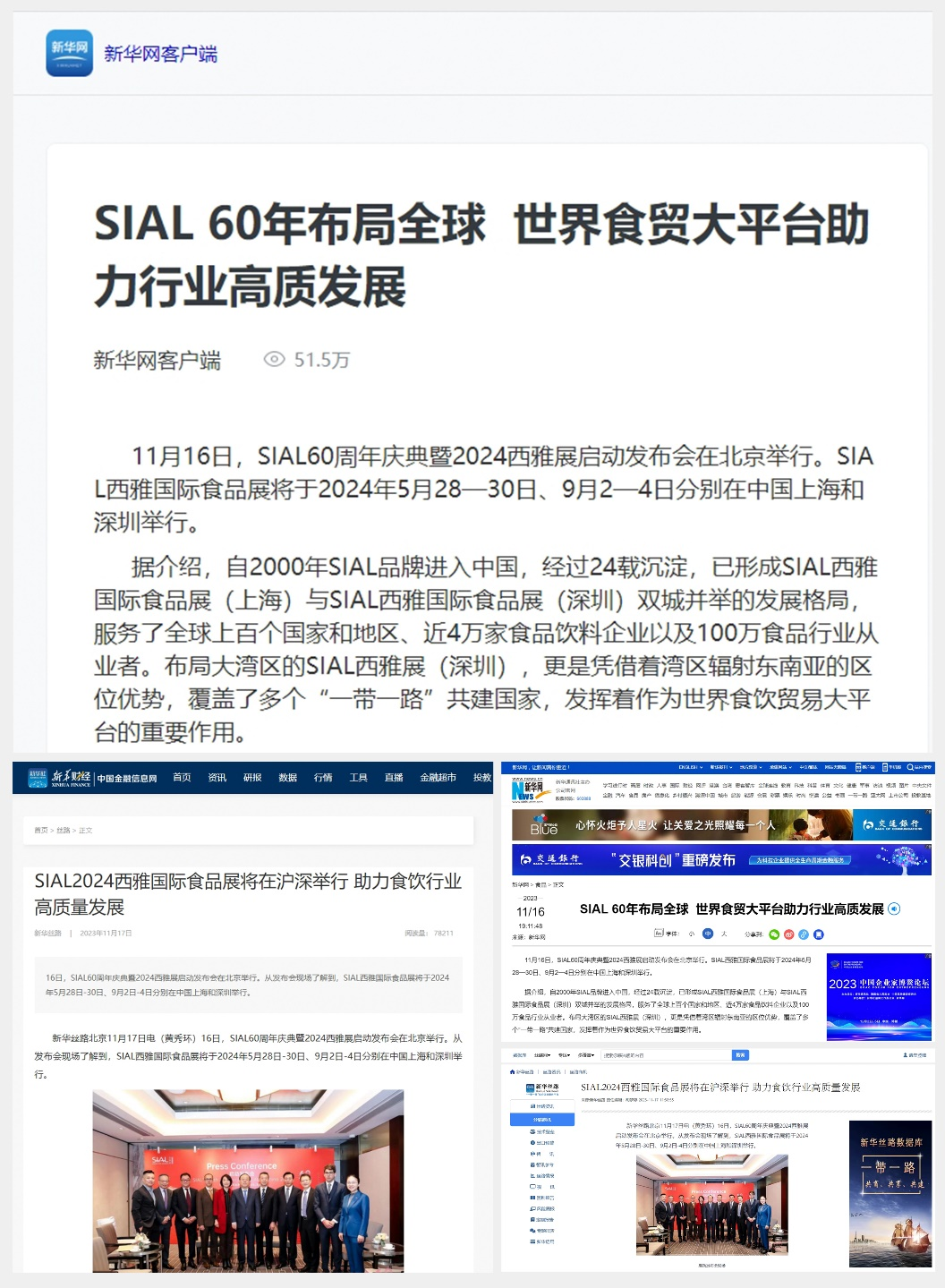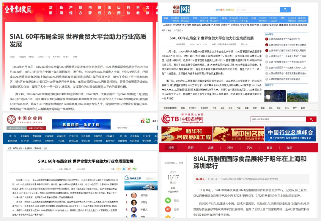 11月16日,SIAL60周年慶典暨2024西雅展啟動發(fā)布會在京舉行。隨后一條題為“SIAL 60年布局全球 世界食貿(mào)大平臺助力行業(yè)高質(zhì)發(fā)展”的消息迅速被新華網(wǎng)、人民網(wǎng)、環(huán)球網(wǎng)、CHINA DAILY等主流官媒以及一眾行業(yè)媒體競相報道,百余媒體強勢聚焦,SIAL西雅展影響力再破圈。
