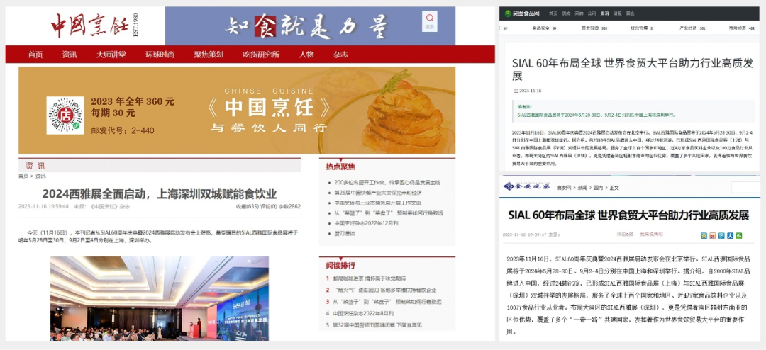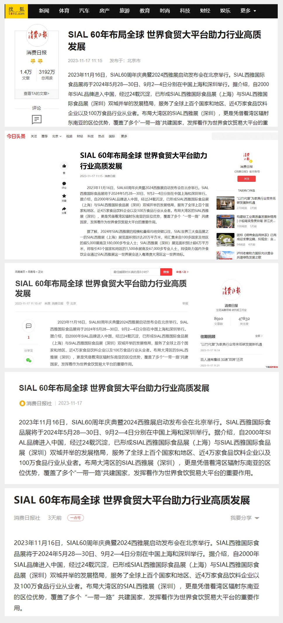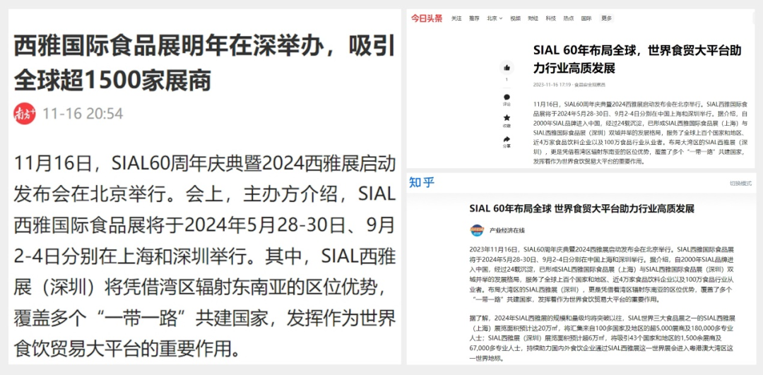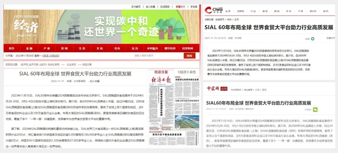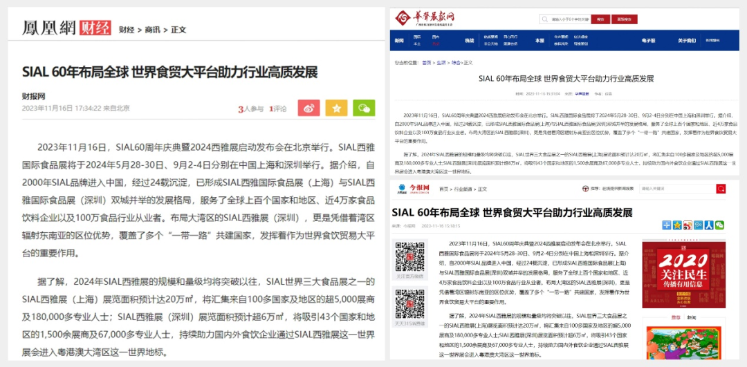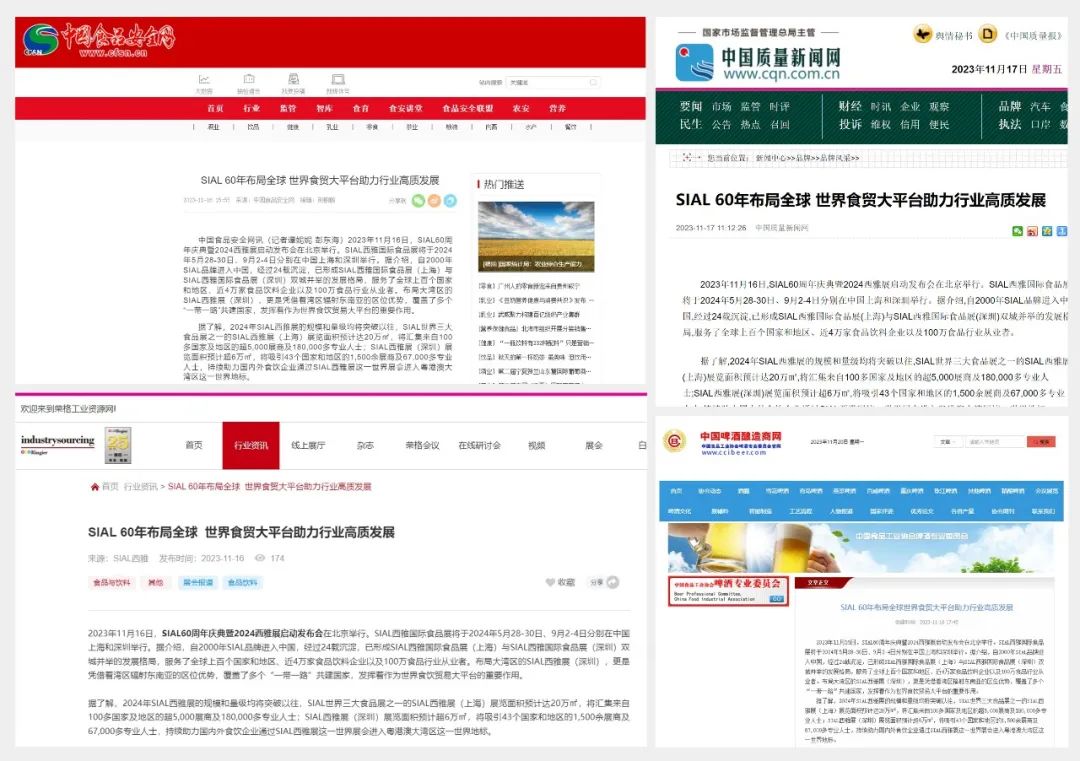 11月16日,SIAL60周年慶典暨2024西雅展啟動發(fā)布會在京舉行。隨后一條題為“SIAL 60年布局全球 世界食貿(mào)大平臺助力行業(yè)高質(zhì)發(fā)展”的消息迅速被新華網(wǎng)、人民網(wǎng)、環(huán)球網(wǎng)、CHINA DAILY等主流官媒以及一眾行業(yè)媒體競相報道,百余媒體強勢聚焦,SIAL西雅展影響力再破圈。