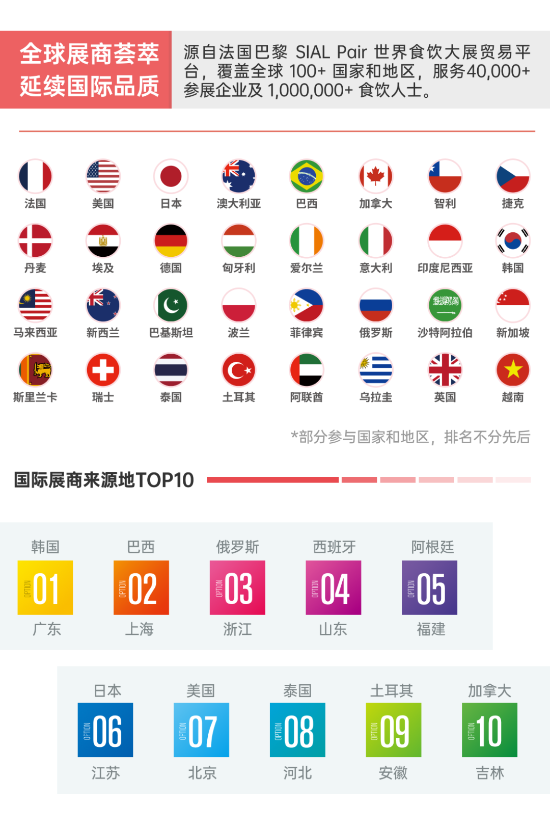 作為以國際性、專業(yè)性、貿(mào)易性以及創(chuàng)新性著稱的世界食飲大展,2024 SIAL 西雅展上海不僅有來自中國、巴西、土耳其、阿根廷、美國、西班牙等70+國家及地區(qū)的國際展團(部分國際展團的場館面積超上千平方米),更有來自全球各地的專業(yè)國際買家團到場采購。